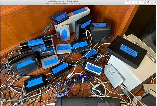 Gathered here for a portrait in a corner of my desk in Manhattan are eighteen hard drives, including the 2Tb one in the laptop I’m using now. That one has 359.75Gb available. Most of the others you see are also full, dead, or both. I also have a similar collection of drives in Santa Barbara, though I only use the 10Tb backup I keep there.