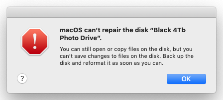 Photos occupy most of the data I’ve stored on all those drives. Currently my photo archives are spread between two portable drives and my laptop, and total about 6.5Tb. I also have a 5Tb portable drive for videos, which is back in Santa Barbara awaiting dubs off of tapes. The portable photo drives are among those in the picture above. Earlier today, my laptop gave me this news about the main one, called Black 4Tb WD Photo Drive: