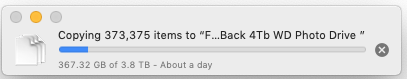 About 5Tb of Elements is occupied by Apple Time Machine backups. After the transfer is done, there won’t be room for more backups. So my project now is figuring out what to do next.