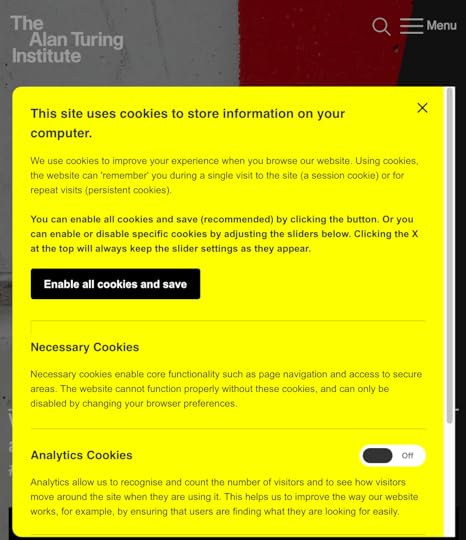 Among the many important things the Turing Institute is doing for us right now is highlighting with that notice exactly what’s wrong with the cookie system for remembering choices, and lack of them, for each of us using the Web.