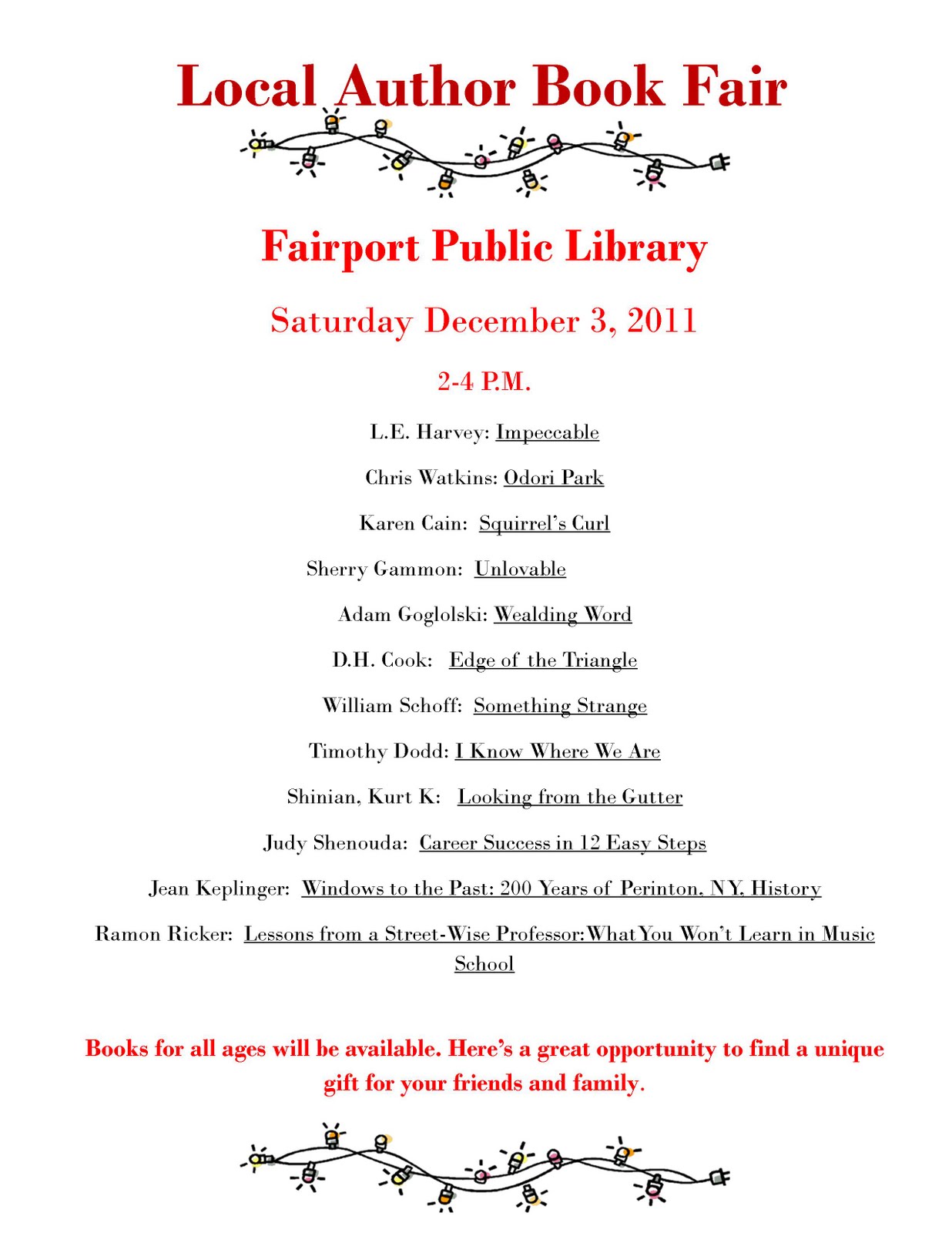 So if you have DECEMBER 3rd from 2-4pm open, and you are in the area-Fairport NY, Does that name ring a bell to anyone;}} stop by and see me! I will be giving away FREE bookmarks!!-