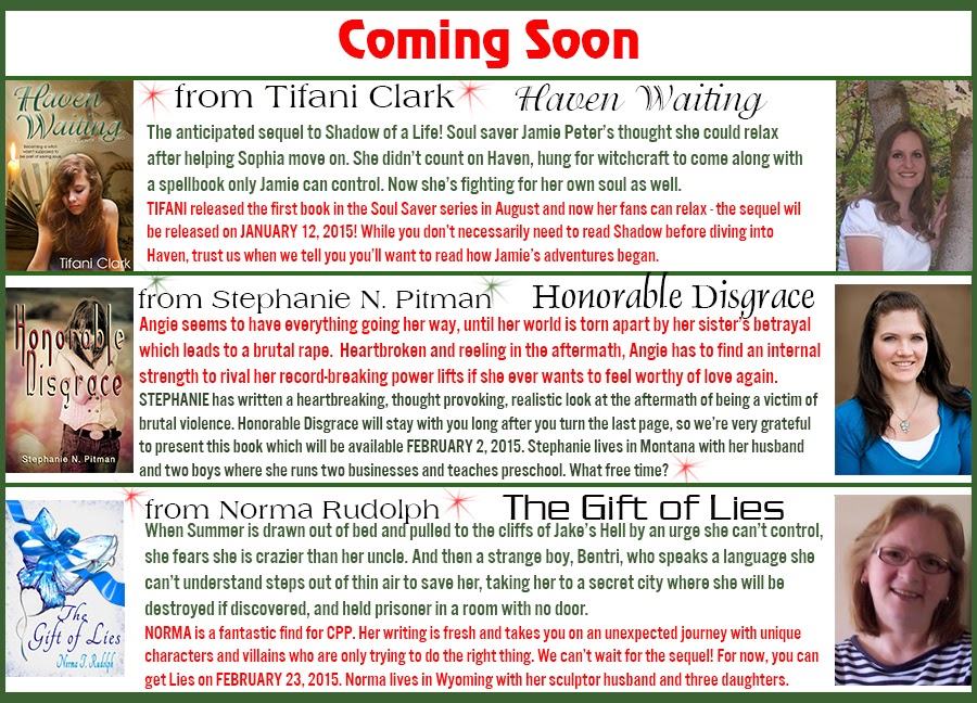 PRE-PURCHASE HAVEN WAITING As mentioned above Tifani will be here December 16th.PRE-PURCHASE HONORABLE DISGRACE Stephanie will be here December 23rd to talk about ways to keep a Christ centered Christmas.PRE PURCHASE THE GIFT OF LIES Norma will be here on December 20th to give us the history of the ninth reindeer - Rudolph (of course).