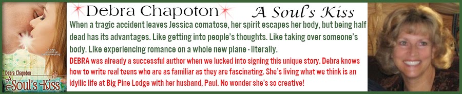 Merry Christmas and Hello! I’m Debra Chapoton, author of A SOUL’S KISS, and I have the honoring of guest posting on day 4 (Four Calling Birds) of The Twelve Days of Christmas. I thought I'd show you what Christmas is like when you live in a full log home. To decorate our place, we call it Big Pine Lodge, there are four fundamental elements that are indispensable — think four calling birds — and they are: a giant wreath, railings that drip with greenery and lights, a sentimental display of Christmas music boxes collected over many years and a big tree decorated with rustic ornaments.