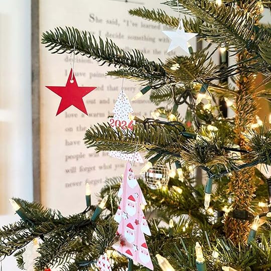 I decided to hang these on the tree too. I love how they look on there and I might do a few more. I punched a hole in the top tree and then used an ornament hanger to place them around the tree.