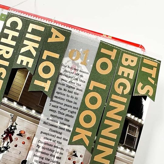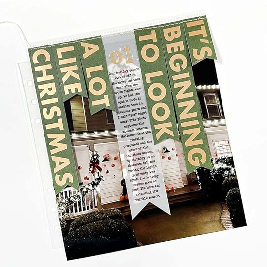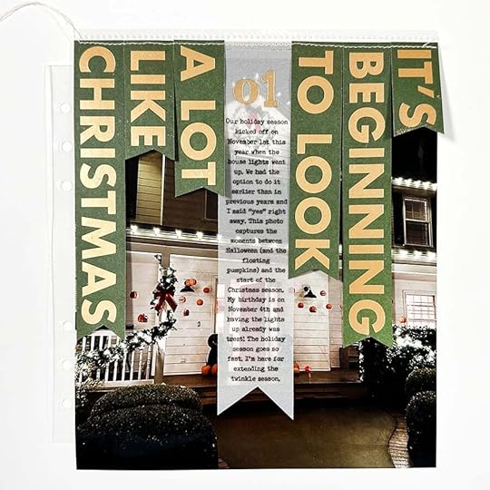 To start off my storytelling I printed out a full page photo of my house the night that we got our lights put up. This year is was extra early and we still had Halloween pumpkins hanging from the porch. I had set aside one of the pattern papers from Main Kit knowing that I wanted to figure out a way to include it in my 6x8 album. I've used a variety of the 10x8 papers in my foundation pages already and have enjoyed folding many of them to create flip outs. For this one I was interested in playing around with the idea of cutting up the phrase and orienting it vertically on the page in some way. Check out the video below to see how this came together and the decisions I made along the way.