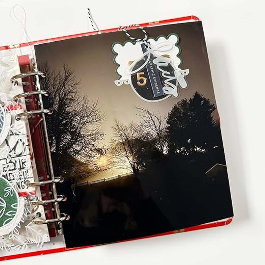 For the second page I used a 1.5 inch circle punch to punch circles from some of the gifts I received today. I stapled those onto the plastic tags. I embossed the number 6 onto a gold rimmed circle tag and added tab stickers to the tops of each of the photos. To finish it off I used ribbon from one of the gifts and added that to each of the "this December story" tags.