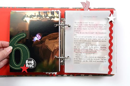 Reading selfie! I read from my phone, so the glow from the screen always lights up my face, but I’ve got to get out my big camera to be able to get the shot because I can’t use my phone as my camera if I’m reading from it, ha! Also!! I saw a great trick to be able to mimic the same capture when reading from an actual book. Tuck your phone with the flashlight on (or a bright screen) in the pages to light up your subject’s face before taking the photo. The demonstration was with kids reading books in front of a Christmas tree and it made the whole scene magical. I printed my photo to be a full 5x6.25 page and added a large green felt number + a wood veneer star from the 2024 December Daily collection + the chipboard “book love” circle from the “Read” Story Play kit.