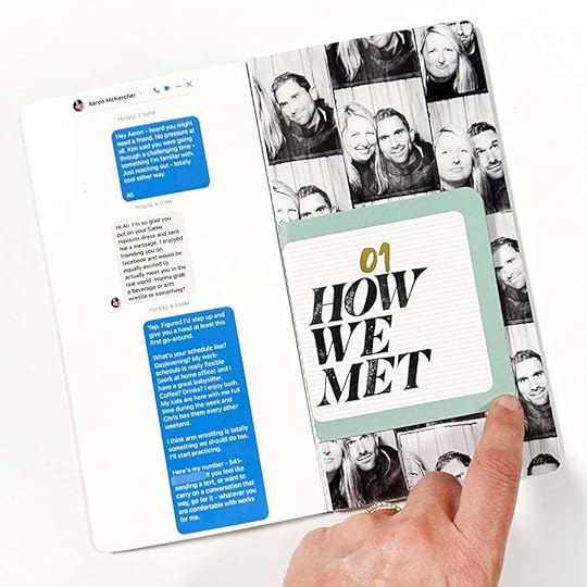 On the front of the 4x4 card I used our Alphas Are Awesome #14 stamp set to add "how we met" and then used sticker paper to add my journaling to the back.