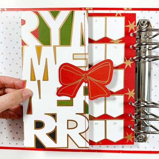 When you turn the page you'll see the folded pattern paper flap. I knew I wanted to add something to the flap that would stick out a bit (in the video you can see me go through some ideas) and ended up choosing one of the red ribbons from the big Die Cut Paper Pack. I ran that through my sewing machine to stitch in place. You could also adhere it with a brad or double sided adhesive or some handstitching.