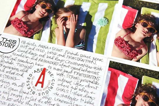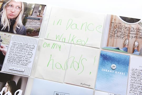 I'm still loving including things Anna has drawn - both words and pictures. This wee she was super excited about being able to walk on her hands. She came back from dance so pumped up that she wrote this up for me immediately because I was on the phone when she first got home. Cutting up something this size to fit in three pockets is also a fun way to break-up and play around with the overall design of the spread.