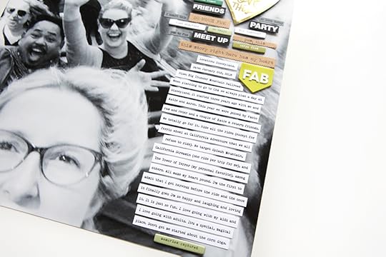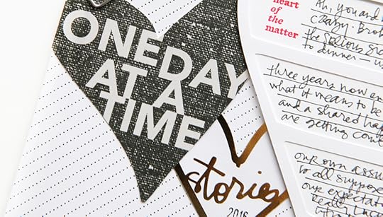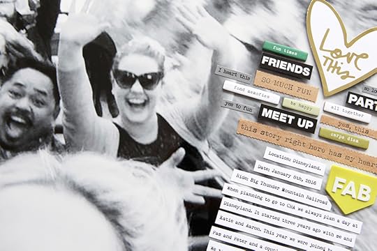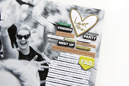 At the top the cluster of embellishments includes a large gold-foil heart from the Heart Story Kit™ (grey phrase stickers are also from that kit). The brown perforated phrases are from the Cheer Story Kit™. The chipboard phrases are from Freckled Fawn's Together Is Best kit. The black and white stickers were included with the Gatherings Story Kit™. "Fab" is from the Canyonlands Scrapbook Kit.