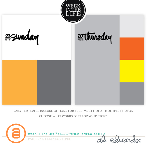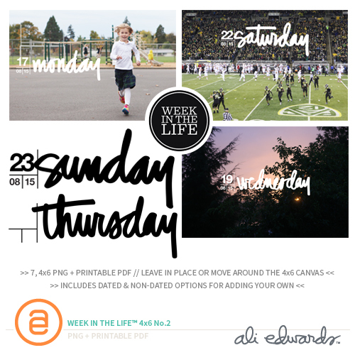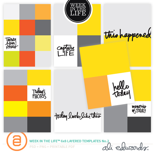 Week In The Life™ layered templates (in 6x8 or 8.5x11) or the 4x6 printable cards/overlays (these are great if you just want to include pieces of this project in Project Life®). I'll be using some of the 6x8 templates (specifically the full page daily one with the days of the week). See below for more details on those sets.