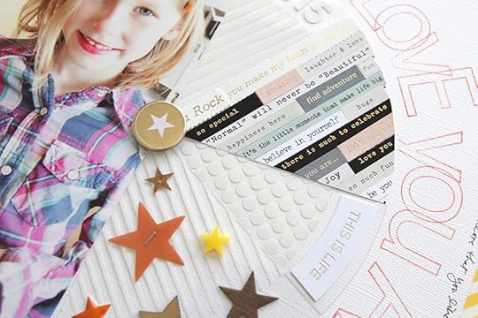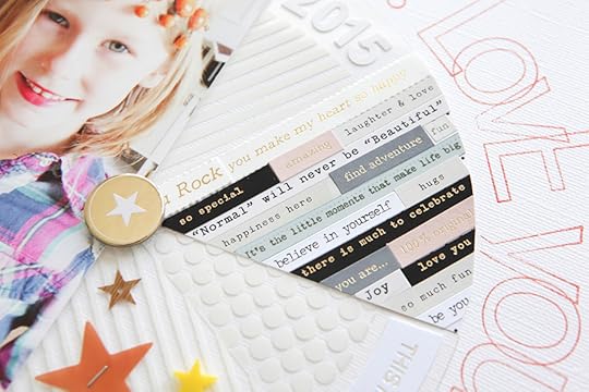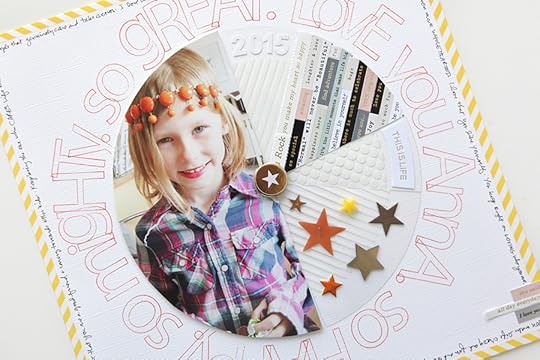 The top one features "2015" using these AE white alphabet stickers. The second one I used the transparent piece to cut a template out of cardstock (so I could use the transparent piece again in the future vs. adding the word phrase stickers on top) and then added a bunch of different word // phrase stickers on top and trimmed them all at the end to fit to the pie piece. I love how that turned out - such a great way to use your stash. The third piece of the pie features the "this is life" die cut sentiment that was also included with the Click kit. On top of the fourth piece of the pie I added an assortment of stars from previous Studio Calico kits.