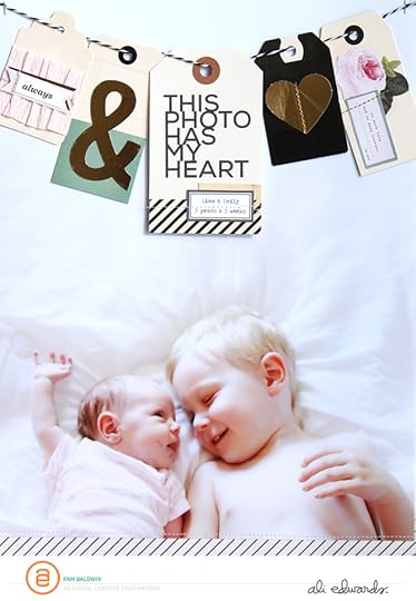 Pam Baldwin // Adorable photo and banner to go along with it. Pam printed the word art onto a tag and combined it with a bunch of other embellished tags, strung together across the page with twine.