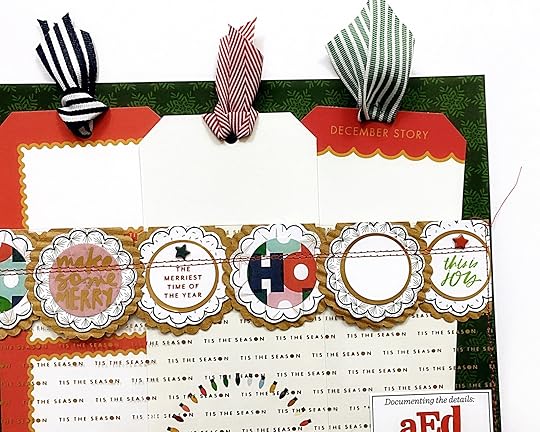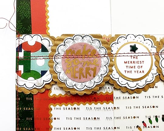 I created a pocket using one of the papers from the Merry Merry 10×8 Paper Pack and the 10x8 Tis The Season transparency. I made a line of circles across the middle of the transparency and ran it through my sewing machine. I then cut the transparency down to make the pocket and sewed it to the background paper. I added some colorful circles, a few Gold Foil Die Cut Circle Labels, and the Make More Merry scalloped plastic square (punched into a 1 ½ inch circle). I did a bit more stamping on two of the Gold Foil Die Cut Circle Labels using the Our Merry Era 4×6 Stamp Set by Paislee Press. I left the last one blank to add the story number when it makes it into my album.