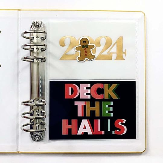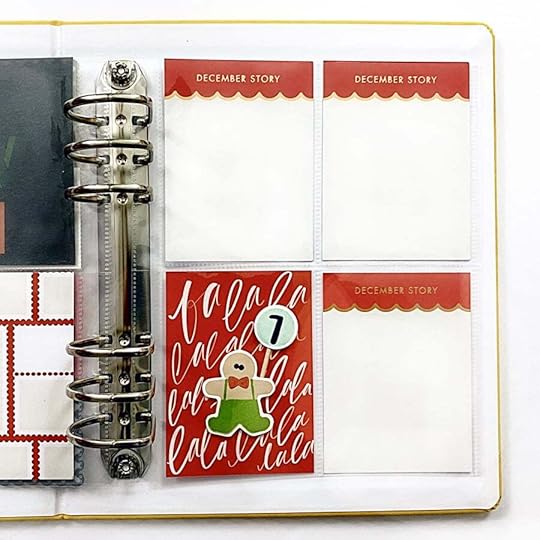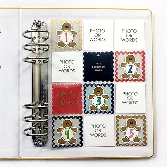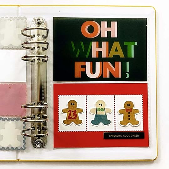 In the photo below, I added 7/8-inch circles (stamped with numbers from the Number 4×6 Stamp Set) to the gingerbread folk and then mounted them on top of some of the Scalloped Plastic Squares. I slipped them into the pockets of a 6x8 page protector. In the open spaces, you could add photos and/or journaling. You could also staple the Scalloped Plastic Squares to the outsides of the pockets and have your journaling underneath. That would leave room for more photos, and the journaling would peek through the plastic pieces which always makes me happy!