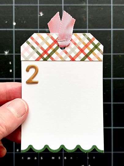 Then I used another tag as a template to cut down the corners, punched new holes at the top, and embellished with gold numbers a a pink ribbon.