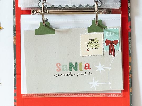 My daughter writes a letter to Santa every year and I thought it would be fun to make a decorative mailing envelope to hold some writing or even a photo of her letter to Santa. Using one of the papers from the Merry Merry 10x8 Paper pack, I designed the envelope so it would measure 4” x 6” and would go into the album with page attachers. As I said in the video, originally I thought I would make the envelope the full size of the page protector so that I could directly punch holes into it, but I realized that the 10x8 paper was too short to make this work, given the measurements I was using.