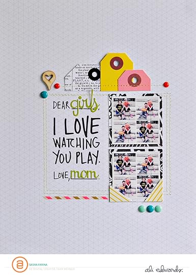 Sasha Farina (linked to layout) | Click on over to Sasha's blog to read more about how she put this page together - I love that she printed the digital part directly onto the pattern paper and then built her page up around it. Super cool. And I love yellow stitching.