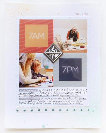 I started with a blank piece of white cardstock (8.5 x 11) and I added just a bit of Heidi Swapp Color Shine spray ink to the top and the bottom (Mint and Mustard). I cropped and paired each of my photos with the tranasparnet 7AM and 7PM cards (included with the AM/PM Story Kit™) and adhered them onto another piece of white cardstock that I used as a mat and home for the photos and journaling. Where the photos and the transparent squares meet I layered the "day/night" chipboard diamond and the "this is life/hello everyday" chipboard phrase strip. Below I added "the story of this morning" and "the story of this evening" stamps along with my simple journaling about what was happening around here at those times. A little strip of star vellum from Crate Paper peeks out from the bottom and I ran the whole thing through my sewing machine to add a stitched border around the main content. I finished it off by stamping the date in red ink along the top edge.