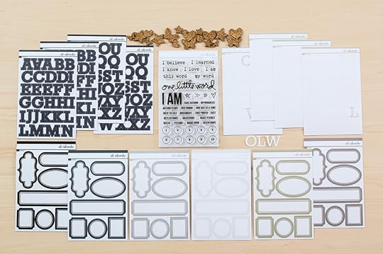 It was just re-stocked this week after selling out to class participants earlier this year. It's a great value at $15.99 and includes everything you see above: a 4x6 stamp set, six sheets of label stickers, cork shapes, and two sets of white and dark grey letter stickers. I'll be using some of these supplies throughout the year in my One Little Word® album.