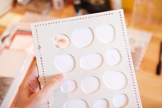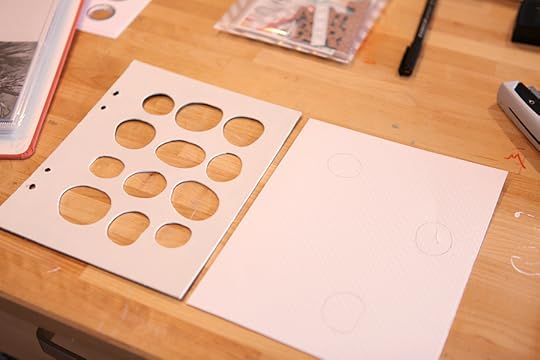 When I put my foundation pages together I painted the front side of the die cut chipboard with cream paint. When it came time to put the page together I cut a piece of cardstock to the same size and then choose three of the circles to trace and then cut out so I would be able to see through to the next page.