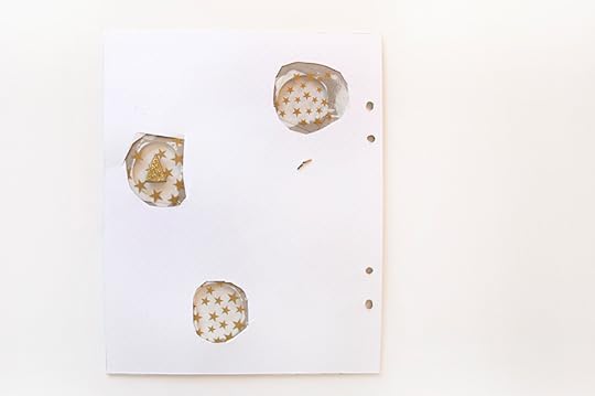 I actually ended up cutting two pieces of cardstock. The first one became the back for the embellishments. The second piece of cardstock is to use as a template when I print out a full page photo for Day Thirteen and want to cut holes in the photo to match (to maintain the see-through part).