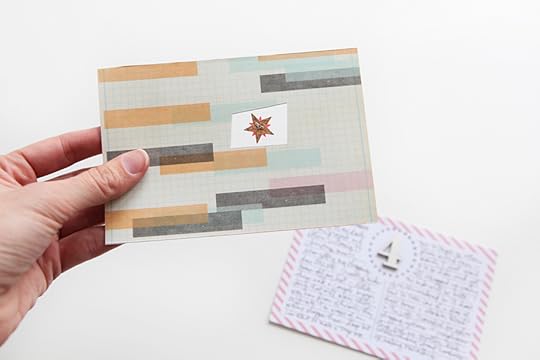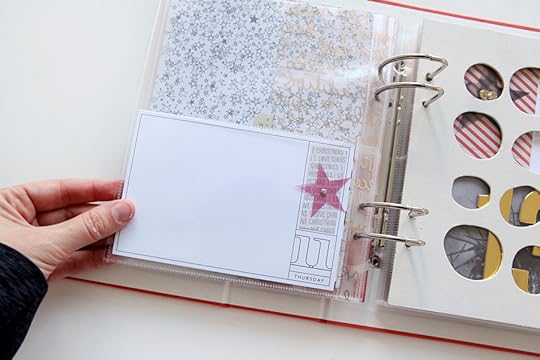 Day 11 so far includes a 4x6 printable + pattern paper + acrylic star + a mini silver brad. I like to use Tim Holtz's Retractable Craft Pick to go through shapes like this (and chipboard) before putting the brad through.