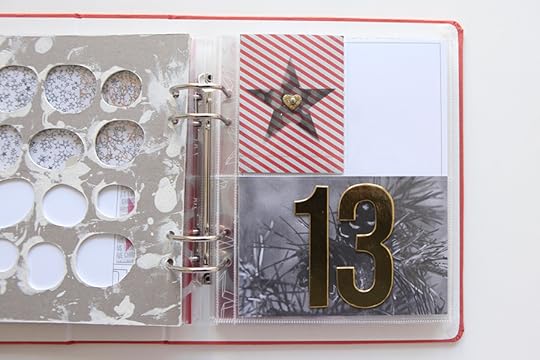 Day 13 so far includes the gold numbers adhered to the pinecone pattern. Above it I added one of the bokeh transparent stars + a gold glitter heart + a silver mini brad on top of the red stripe pattern paper.