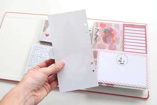 3. I cut the three transparencies in half and am using them as fun dividers. I'll probably move them around during the month so that they go with stories I might be telling, but I might also just leave them right where I have them now. I used the Crop A Dile to punch holes in the sides (use a page protector as your guide) and then I folded over the sticker tabs and stapled them in place with a Tiny Attacher. NOTE: There is a "film" - basically a plastic layer on top of the transparencies that you should pull off when you are ready to work with them.