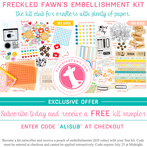 SPECIAL OFFER | If you become a kit subscriber, Freckled Fawn will include a pouch of embellishments ($20 value) with your first kit. Enter code “ALISUB” to take advantage of this awesome offer! Code expires on July 25th.