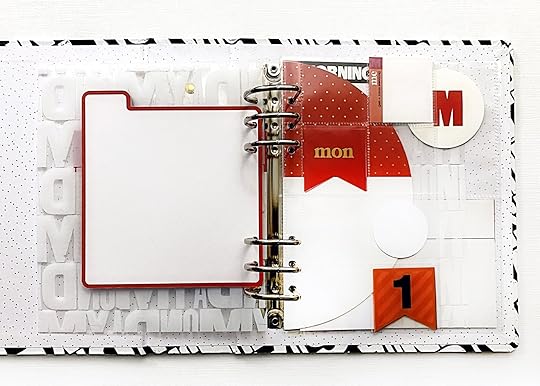 I used the digital version of this card to create my own “checklist” card to go back-to-back with the original 3x8 card. I titled those cards “The Nitty Gritty” created a sort of goal list that I will be able to check off each day. I will either do that with a pen or perhaps a tiny stamp. On the backside of the Pleather Circle, I added a circle from one of the papers in the Daily Quarterly Scrapbook Kit (enlarged to 2.5 inches).