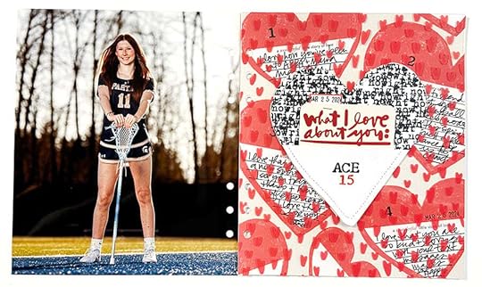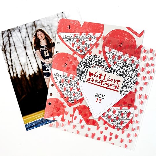 On top of the heart transparency I added a "right now" stitched heart pocket (from a previous release). I slipped the top part of the "what I love about you" journal card into the pocket and added a tab sticker with the date. On the bottom of the stitched heart I stamped Anna's initials and her age.