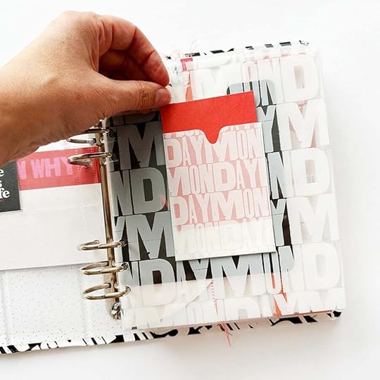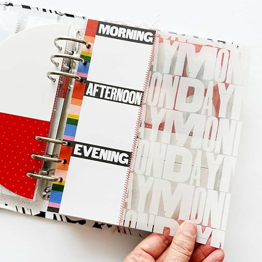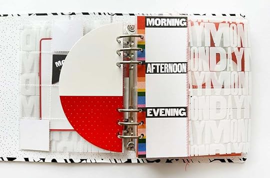 Here's where I took the piece of transparency I cut (from the 10x8) and stitched it to the 3x8 card from the Main Kit. I'm thinking I'll add what I'm listening to and watching in these spots. This would also be a fun spot to document your food or your car trips or some other thing that you repeat in your life each day.