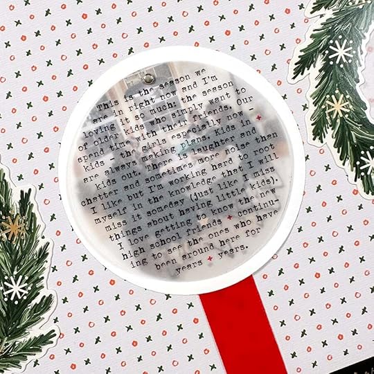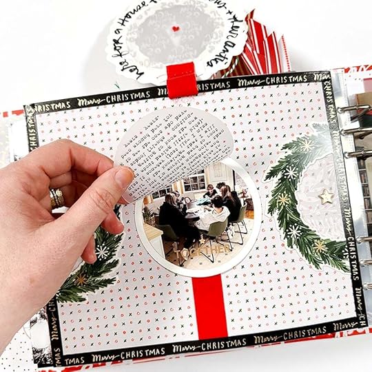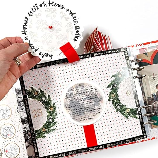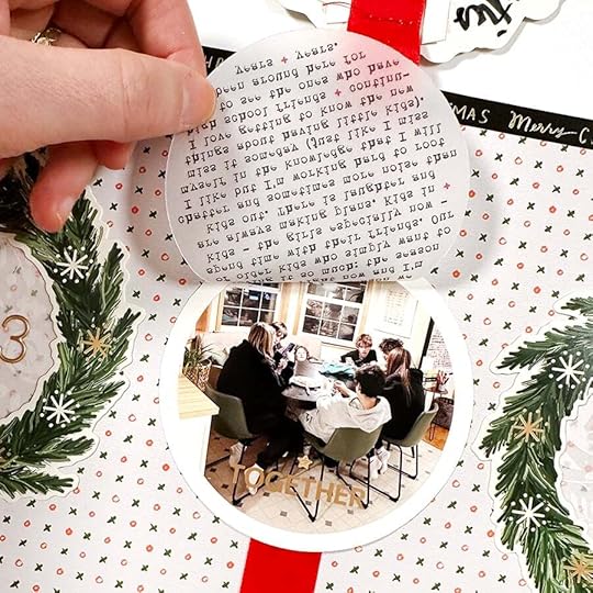 The wreath with the "so much joy" vellum is stitched to the piece of velvet and attached under the washi tape from my stash. It lifts up to reveal journaling printed on vellum that is attached to a circle photo.