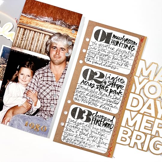 The second part of the spread includes the large die cut page insert stitched to a numbered 3 inch x 8 inch journal card from the Present Story Kit. On top of the journal card I added a 3 inch x 8 inch gold star page and added a photo of me and my Dad from 1980. On the outside of the page I added a gold embossed circle stamp and added gold puffy numbers on top and added a gold tab sticker along the outside edge.