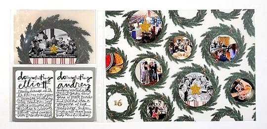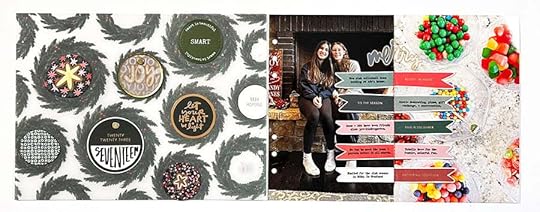 Story 17 ended up being a two-page spread because I needed/wanted to fill in some of the circle spaces on the back of Story 16. I decided that I didn't want to do another round of small circle photos so instead I dove into my December Daily® and my regular stash to locate some circle embellishments that I could add on top.