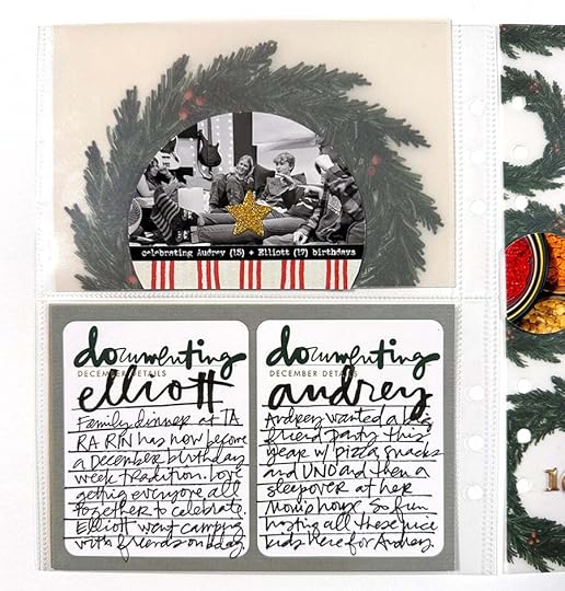 On top of the circle photo (and another one on the second page) I used some washi tape to cover up the portion of the circle that didn't include the photo. For this partial circle I also printed out a custom title that says "celebrating Audrey 15 + Elliott 17 birthdays." For my journaling today I used the prompt card "documenting December details" from the Main Kit. I used a brush pen for their names and then a Slick Writer to document a few details.