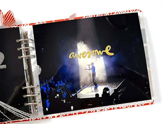 The next page in the spread is part of a large, flip-open that will reveal a big collage of photos along with two 3 inch x 4 inch page protectors. This photo measures 10 inches x 8.25 inches. On top of the photo I added the die cut word "awesome" from a previous Story Kit.