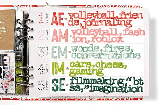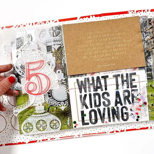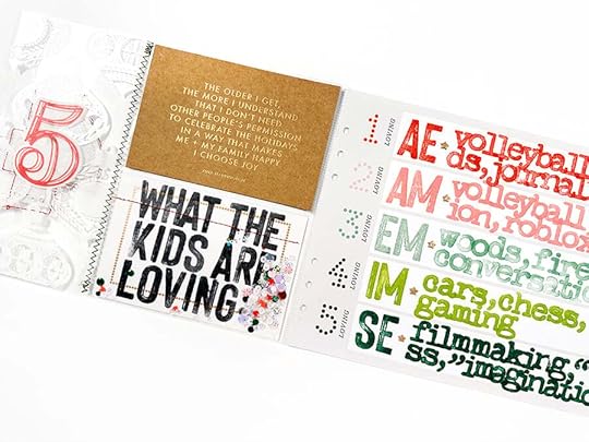 I've known since I worked on kit designs last year that I'd be using this paper for Story 05 in my December Daily® album in 2023. What I didn't know is that I'd be using it as an opportunity to bring in my family's voices into the project. I often do a list of what I'm loving/into in this project (and I might still do one for myself later in the month) but I decided to send a text to our kids and ask them to tell me three things they are each loving in their own lives right now. Super happy with how this turned out!