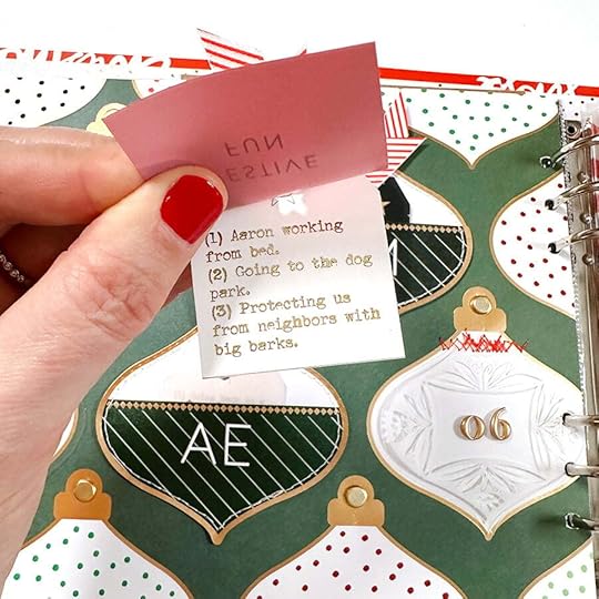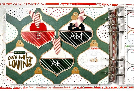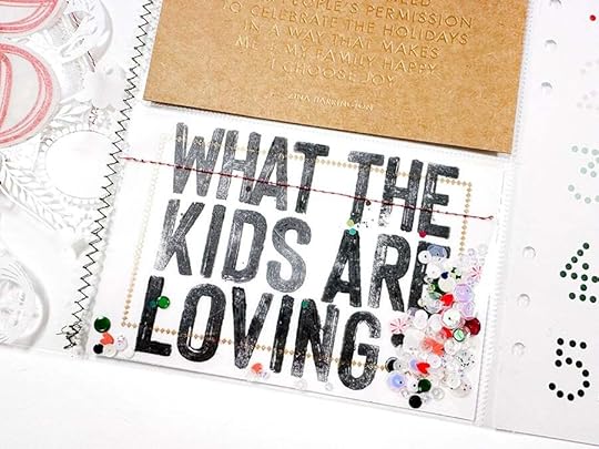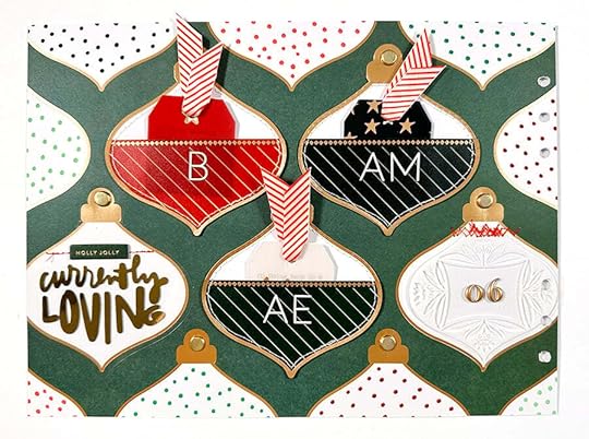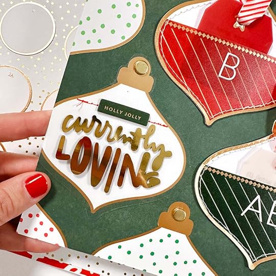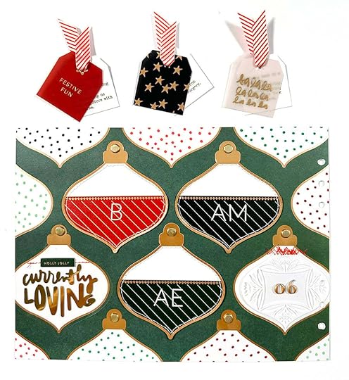 The foundation for this story is the ornament pattern paper and three of the ornament pockets from the Main Kit. Inside each of the pockets I added one of the plastic tags and a printed tag with what I'm loving, what Aaron is loving, and what Betty is loving.