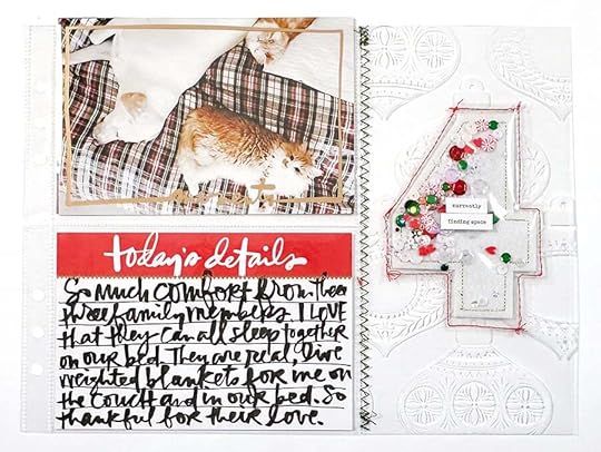 On top of the large number four I added a couple word/phrase stickers about "finding space" - mostly in reference to finding space in our bed when all three of the pets are there too. Real life, my friends, real life.