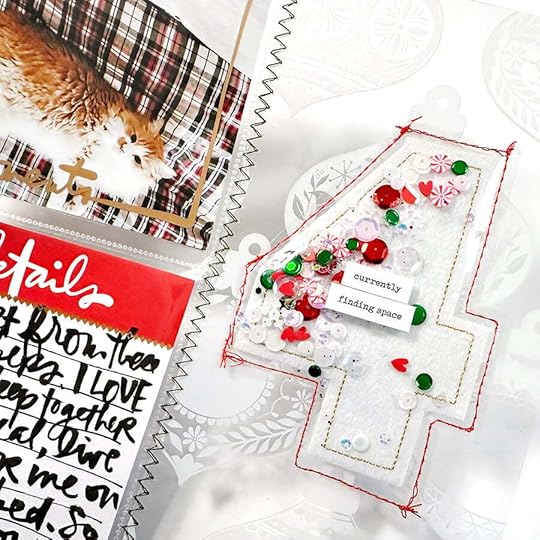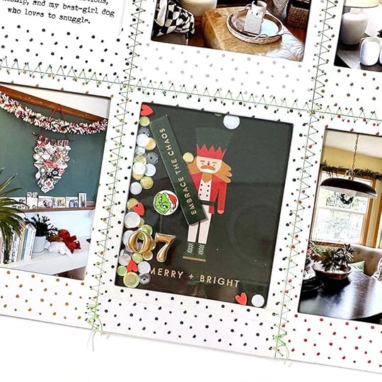 In addition to my words and photos I also decided to create a little shaker on top of the merry + bright card. I added a chipboard phrase "embrace the chaos" and more sequins from The Diary Of Belle Rose. Originally I envisioned I'd add one of the red plastic letters here too but I forgot and simply ended up adding puffy numbers on top of the plastic piece that creates the shaker.