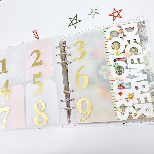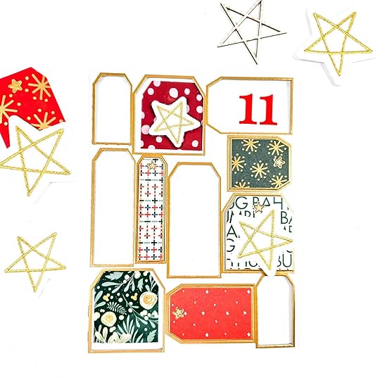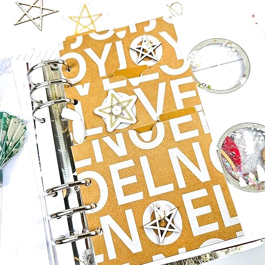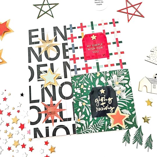 December Daily Main KitDecember Daily Wooden StarsDecember Daily Felt StarsTim Holtz Velvet Trim Sequins Tacky GlueAli Edwards Acrylic Page Attachers Nuvo Drops Gold Ribbon and Thread Red Line Tape Tweezers Paper Trimmer Precision Scissors