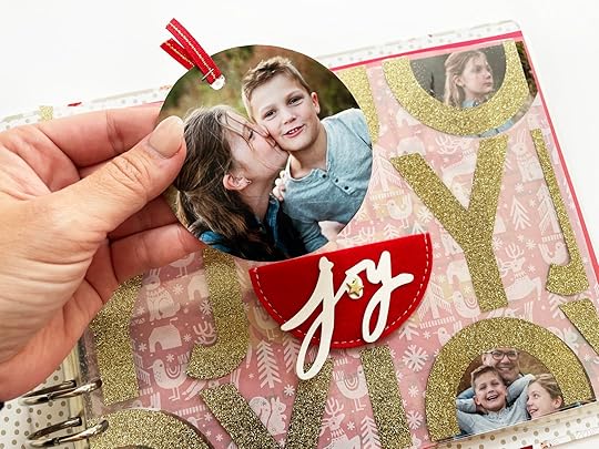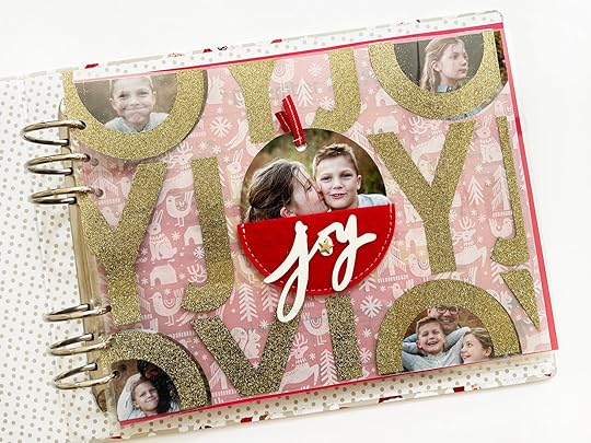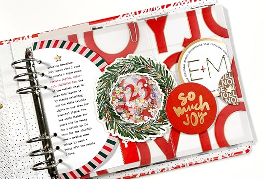 This page includes one of the 1/2 circle die cut pages from the Die Cut Page Insert Pack (digital available) + wreath from the Main Kit + "so much joy" chipboard circle from the Sticker Advent Calendar + large paper circle from the Die Cut Pack (digital available) + gold foil alphabet + plastic numbers + .