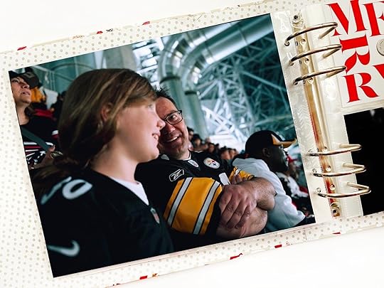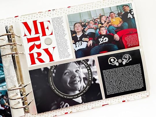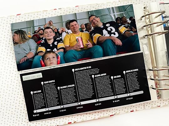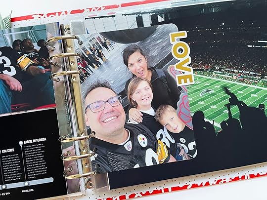 I'm trying to do better about including photos of myself, so I went back and added this one to the already completed story about all of us at the Steelers game. I used a paper die cut as a tab to help flip the smaller page.