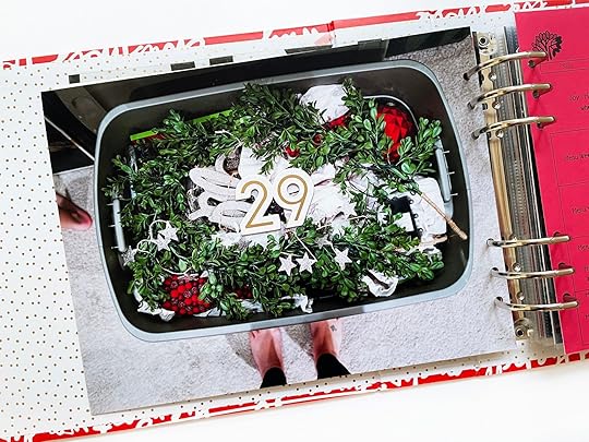 On the back of the specialty paper, I adhered an enlarged photo of one of our Christmas bins. I loved that you could see Ben's little foot in the upper left hand corner. I added the number 29 because this happened November 29th.