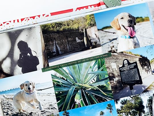 Per the usual, I was just meandering around while mom and I were talking and taking a few photos. Mom had wanted to capture her first visit to the beach. I put a bunch of the pictures into a quick template and adhered one of the vellum phrase strips from last year's kit. The sentiment of a white Christmas felt like a fun little joke on a December beach page.