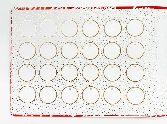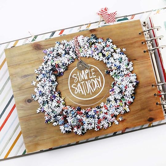 SUPPLIESDecember Daily® Main Kit 6 inch x 6 inch Square Dot Stencil Pom Pom Trim December Daily® Chipboard FramesPage Attacher (another option are the attacher stickers) Versamark Embossing Ink Gold Embossing Powder Paper Pouncer Snappy Tray Heat Gun 3.5 Inch Circle Punch Number Stamp Set Red Line Tape