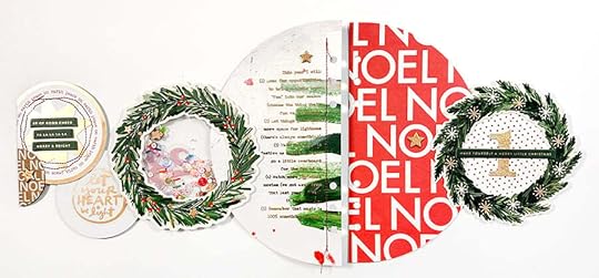 I added another wreath from the Main Kit on the back of the front shaker. I added a clear sticker sheet to the back of the red chipboard circle. On the gold foil circle I added a star from the Main Kit along with three of the chipboard phrases. I ran that through my sewing machine to add the stitching before adhering it to the original circle.